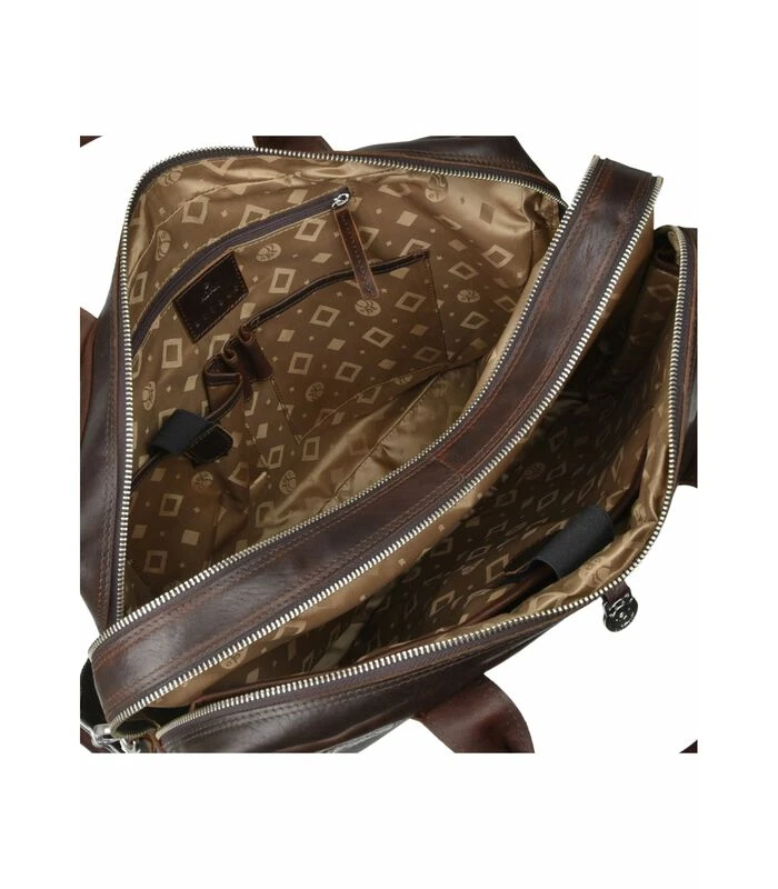 Binnenin zijn er twee grote vakken, één met een laptoptas met klittenbandsluiting en één met een klein ritsvakje, twee open vakken en twee leren pennenhouders.