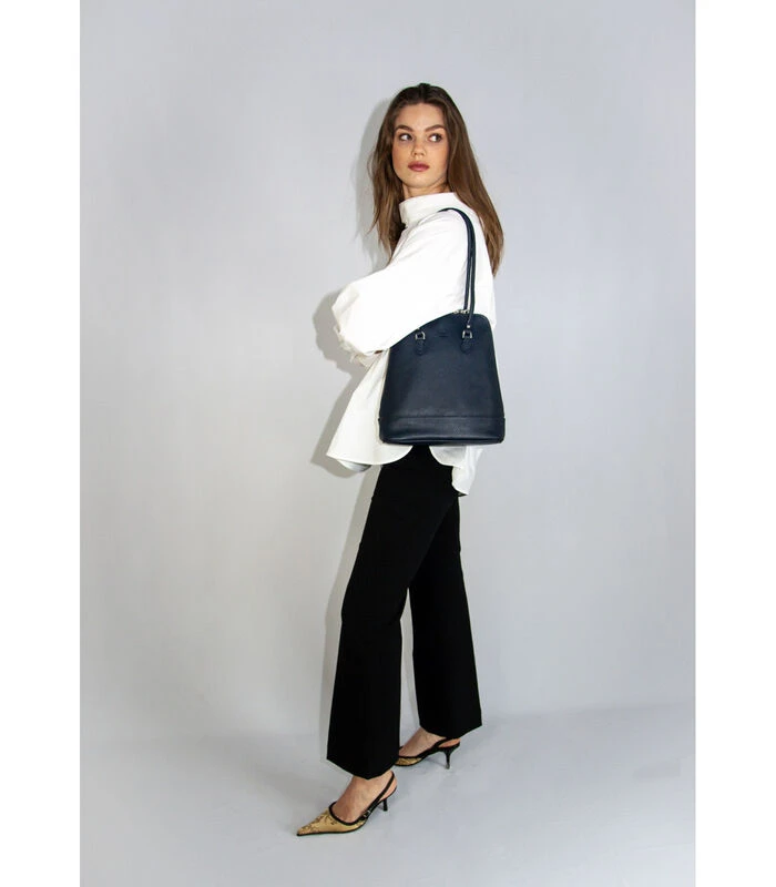 De schouderbanden zijn in lengte verstelbaar. Er is een klein vakje met rits aan de achterkant van de tas. Alle details zijn verzilverd.