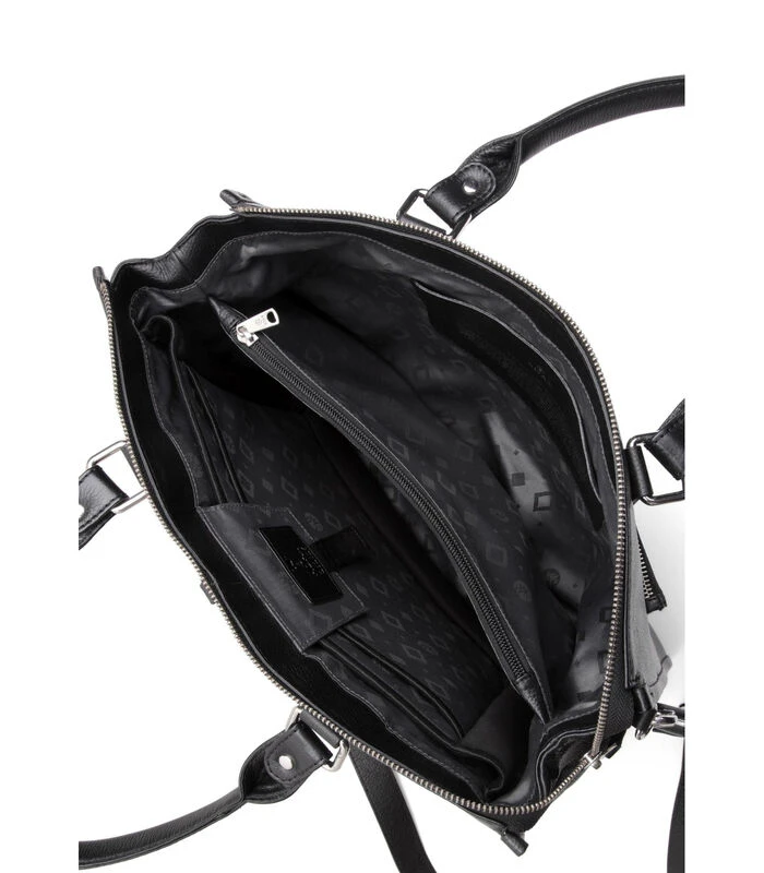 Binnenin zitten twee grote vakken, een ritsvak in het midden en een leren zijvak – perfect om een mobiele telefoon in op te bergen. Bovendien heeft de tas een vak met klittenband dat ruimte biedt voor een laptop.