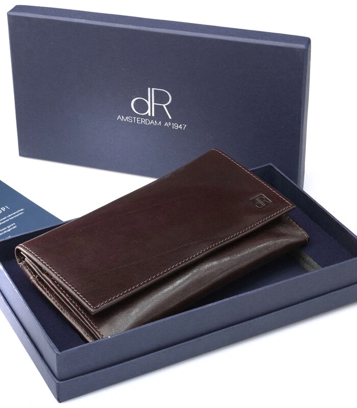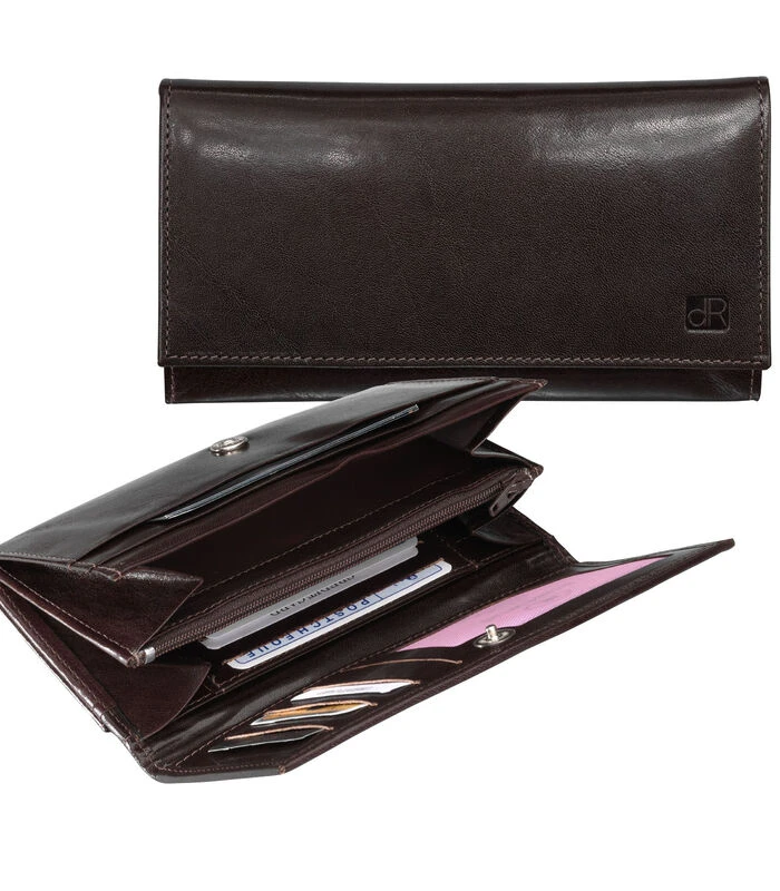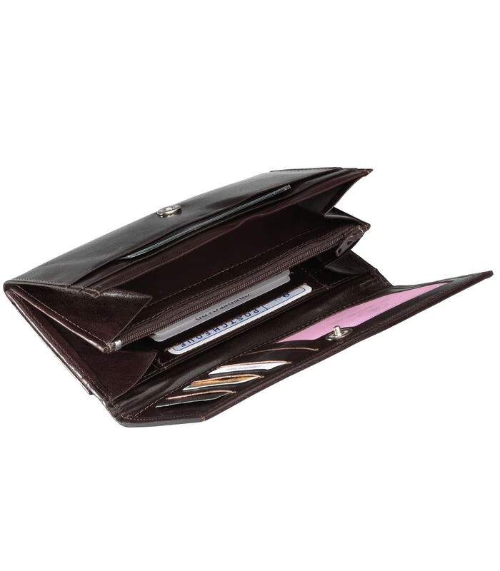 Deze mooie damesportemonnee is vervaardigd uit rundeder en heeft een klassieke uitstraling. In totaal heeft deze portemonnee negen vakjes voor betaalpassen, waarvan een vakje een kijkvenster heeft. Ideaal voor rijbewijs of identiteitskaart. Deze portemonnee heeft twee steekvakken voor papiergeld, een ritsvak voor muntgeld en drie extra vakken voor meer opbergruimte. Aan de achterzijde zit nog een extra ritsvak voor muntgeld en een steekvakje gevestigd.
