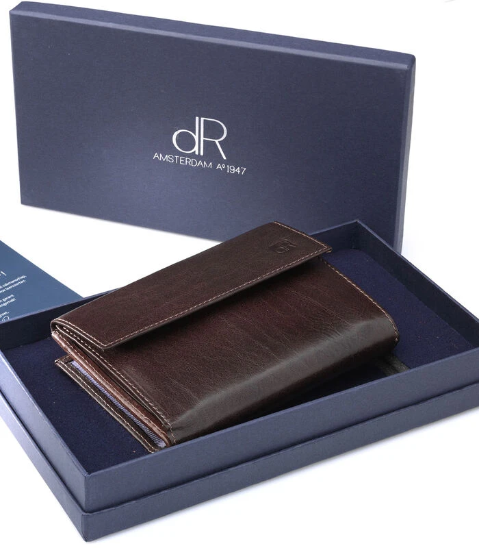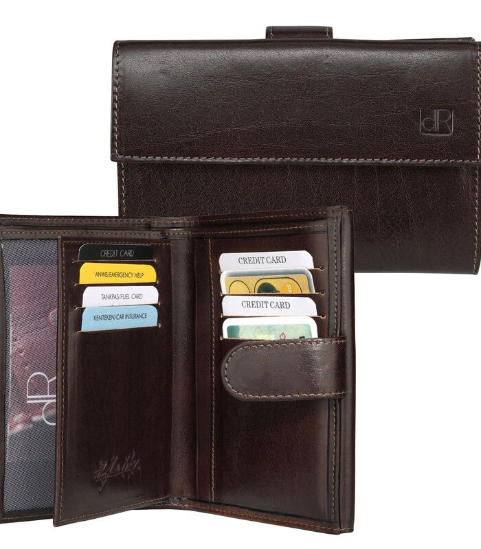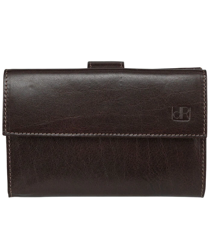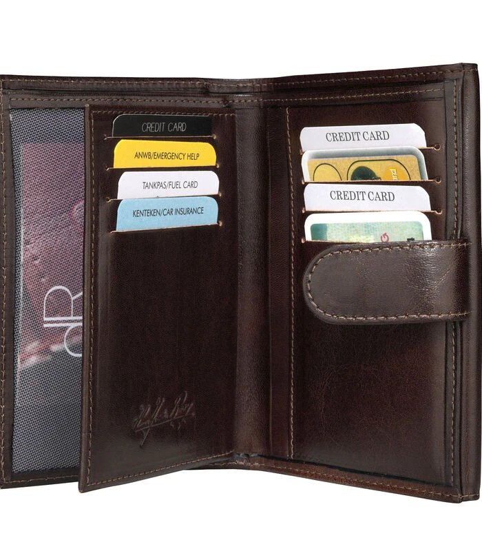 Een functionele damesportemonnee die is uitgevoerd in een zacht leder. De portemonnee is voorzien van een groot muntvak aan de voorzijde en is afsluitbaar met een drukknoop. Het product beschikt over elf creditcard compartimenten, een insteekvak voor papieren geld biljetten en nog vier extra opbergvakken.