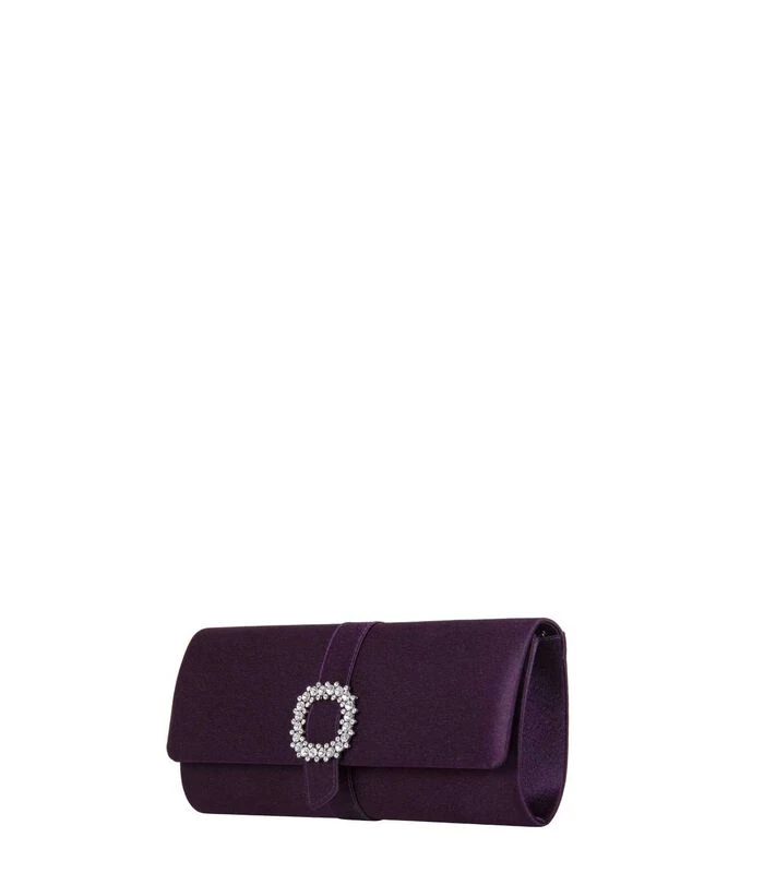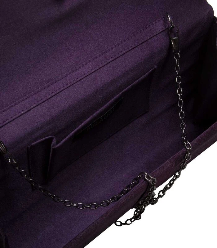 Met deze chique donkerpaarse clutch Stephi, steel je de show op een feestje. Bij deze clutch zit een extra meegeleverde ketting die je kunt bevestigen aan de tas, waardoor je de tas over de schouder kunt dragen. Aan de binnenkant heeft deze tas een hoofdcompartiment met één binnenvakje. De tas wordt gesloten met een overslag en een magneetsluiting. De metaalkleur is een donkere, antraciete kleur. De afmetingen (breedte / hoogte / diepte) van deze clutch zijn 27 x 13 x 03 cm.