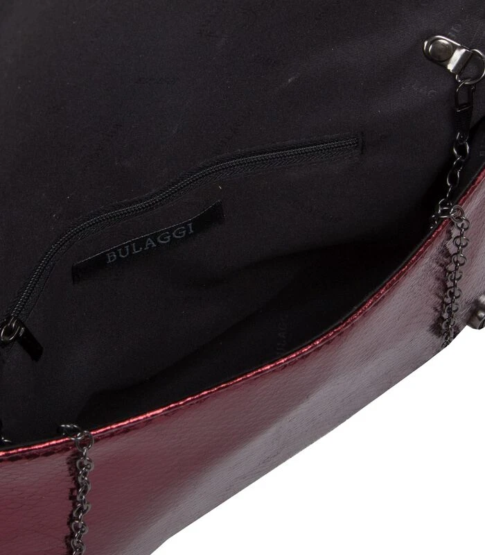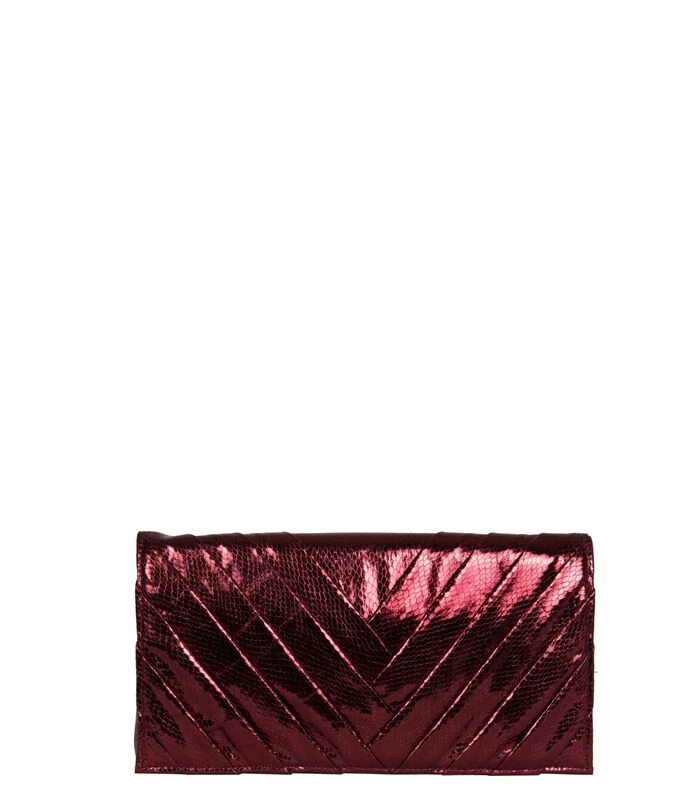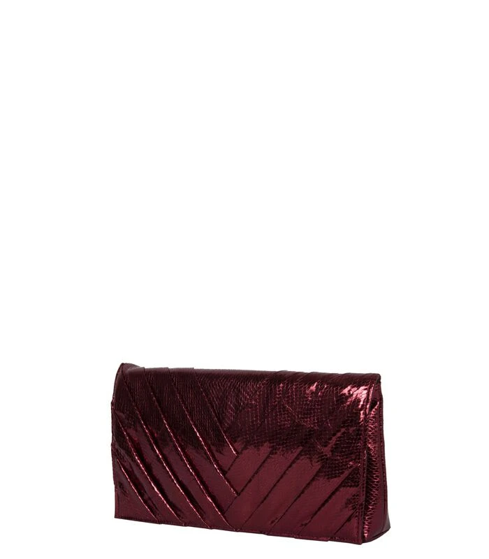 Deze bordeaux rode clutch Waterfall, is een absolute must–have voor een avondje uit. De all–over reptielenprint met een lichte glans in combinatie met het visgraat motief aan de voorkant, geeft deze tas haar wow factor! Bij dit tasje ontvang je twee afneembare schouderkettingen. Een langere ketting en een kortere ketting. Aan de binnenkant heeft deze tas een hoofdcompartiment met één binnenvakje. De tas sluit met een overslag en magneetsluitingen. De metaalkleur heet ‘gun metal’ en is een donkere, antraciete kleur. De afmetingen (breedte/ hoogte /diepte) van dit tasje zijn 27 x 14 x 04 cm.