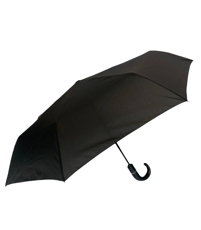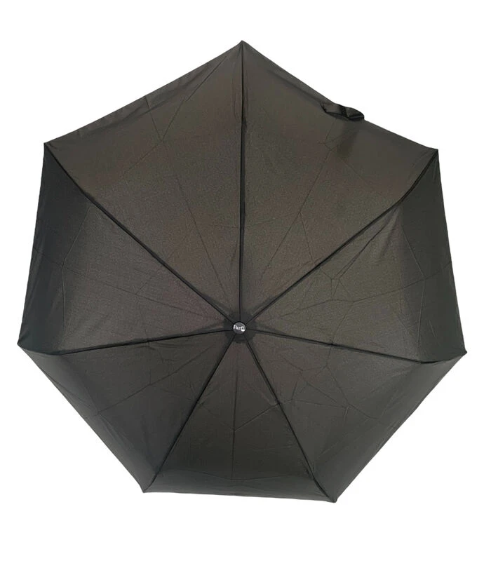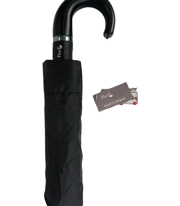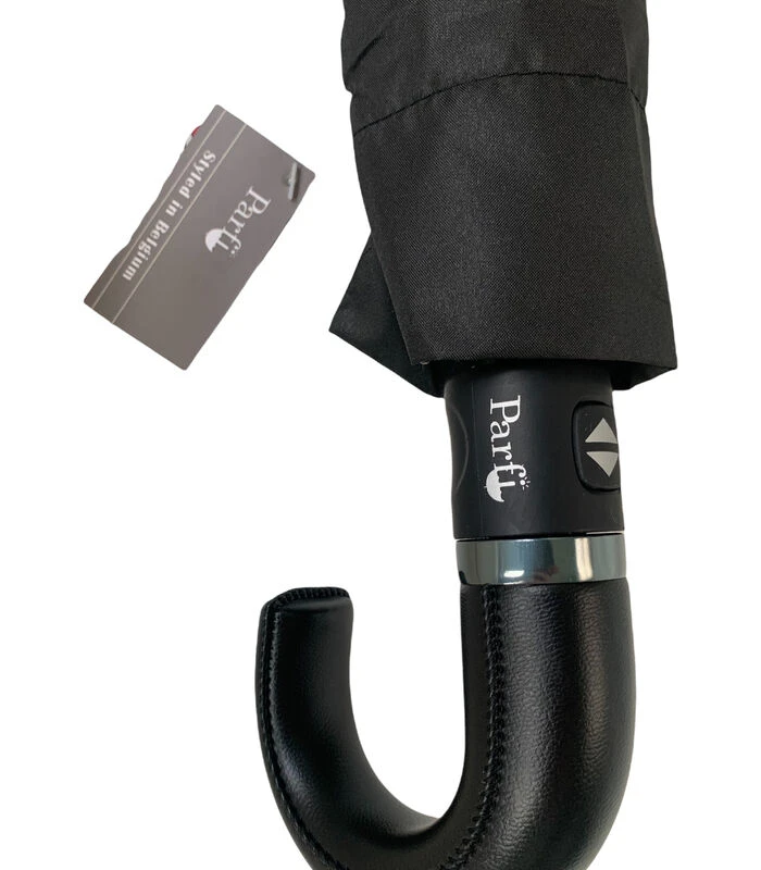 Parfi is een Belgisch merk. Deze paraplu is met automatische opening en sluiting , stof is effen zwart, kruk in simili leder , lengte van de paraplu gesloten is 34cm, diameter open is 93 cm en hij is geleverd met een zwarte hoes.