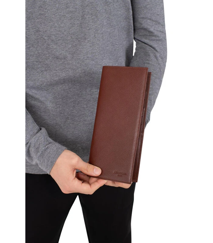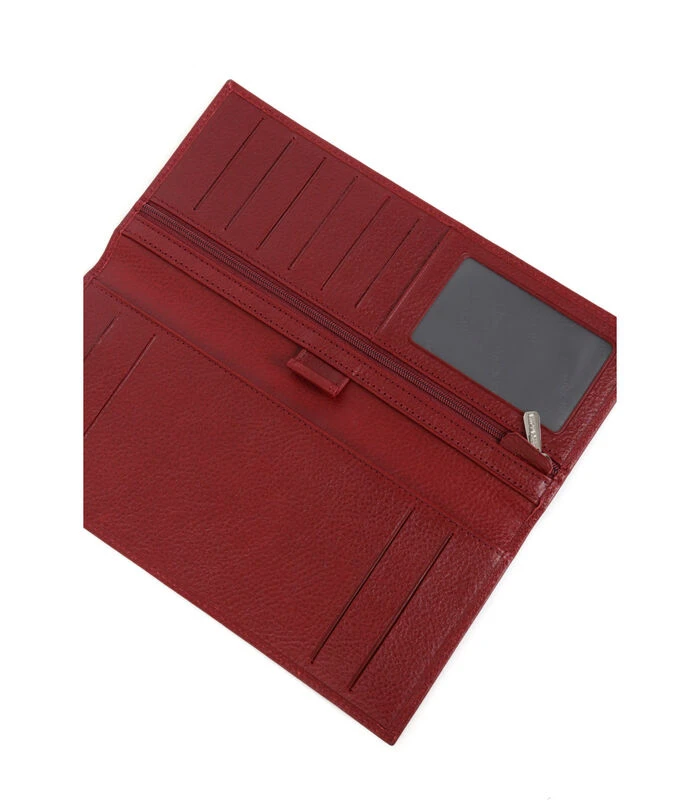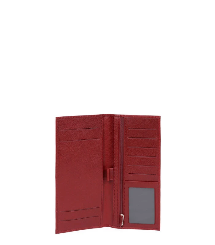 – Intérieur : 1 volet. 1 porte–monnaie zippé. 3 poches plates (dont 1 à vue transparente). 6 emplacements carte. 1 espace chéquier. 1 espace stylo.