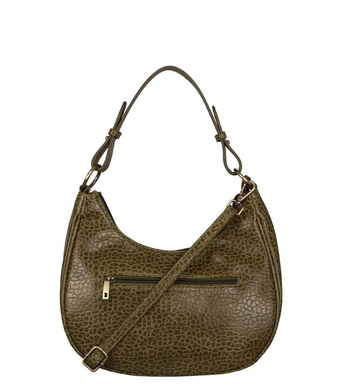 Deze casual kaki groene hobo schoudertas Naomi, is compact, maar wel superhandig. Je kunt er al je essentials in kwijt. De tas heeft een all–over dierenpatroon. Deze hobo schoudertas heeft een korte, enkele (niet verstelbare) schouderband die je zeer prettig op de schouder draagt. Dankzij de extra meegeleverde lange (verstelbare) en afneembare schouderriem, kan de tas op verschillende manieren worden gedragen. Aan de binnenkant heeft deze tas een ruim hoofdcompartiment met twee binnenvakjes waarvan één met rits. Aan de achterzijde van deze tas bevindt zich een ritsvak. De tas zelf wordt ook gesloten met een rits. De metaalkleur heet ‘antique brush’ en heeft een messing kleur, als gepoetst goud. De afmetingen (breedte / hoogte / diepte) van deze schoudertas zijn 28 x 23 x 8 cm.