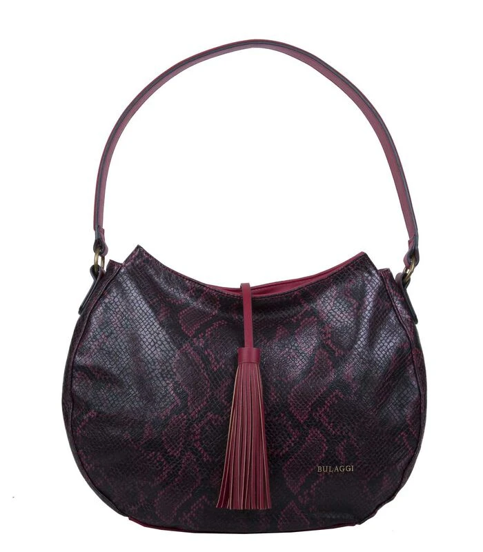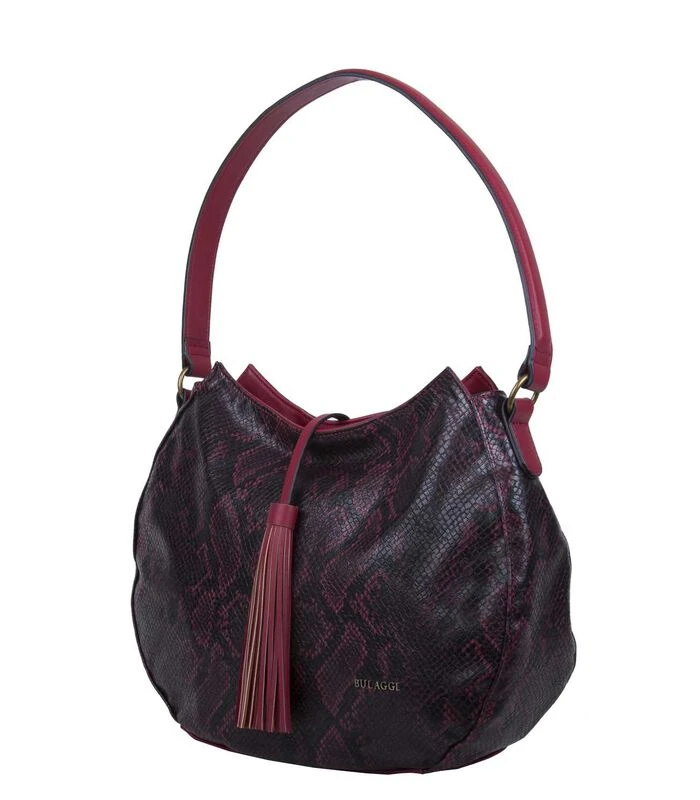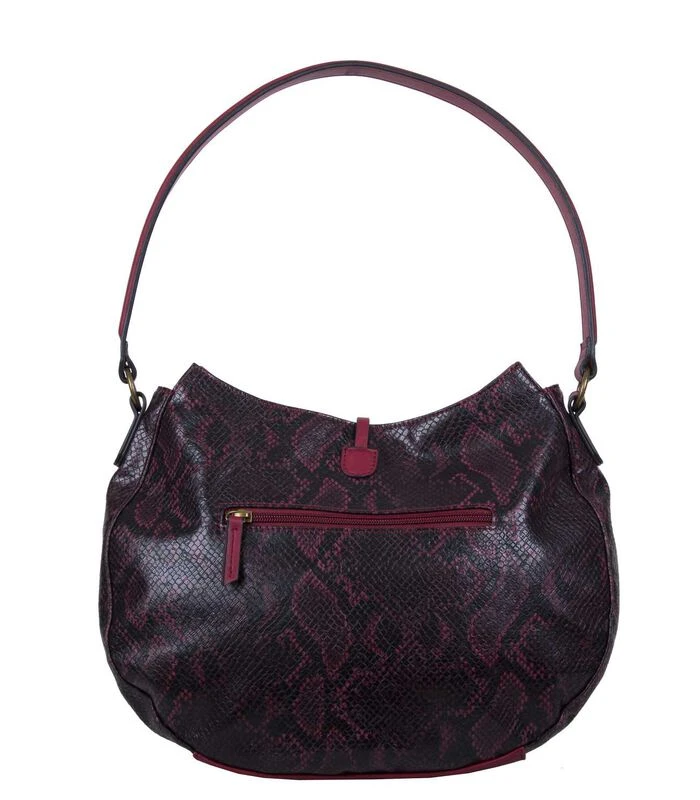 Deze praktische hobo schoudertas Quince, heeft een te gekke all–over slangenprint. De bordeauxrood met zwarte snakeprint op de tas geeft het geheel een rijke uitstraling. De effen bordeauxrode details zoals de schouderriem en het decoratieve kwastje aan de voorkant vormen een perfecte kleurenmatch! Deze hobo schoudertas heeft een enkele (niet verstelbare) schouderband die je zeer prettig op de schouder draagt. Aan de binnenkant heeft deze tas een ruim hoofdcompartiment met drie binnenvakjes, waarvan één met rits.Aan de achterzijde van deze tas bevindt zich een ritsvak. De tas zelf wordt ook gesloten met een rits. De metaalkleur heet ‘antique brush’ en heeft een messing kleur, als gepoetst goud. Bekijk ook eens de bijpassende portemonnee met dezelfde print als deze tas. De afmetingen (breedte / hoogte / diepte) van deze schoudertas zijn 36 x 28 x 10 cm.
