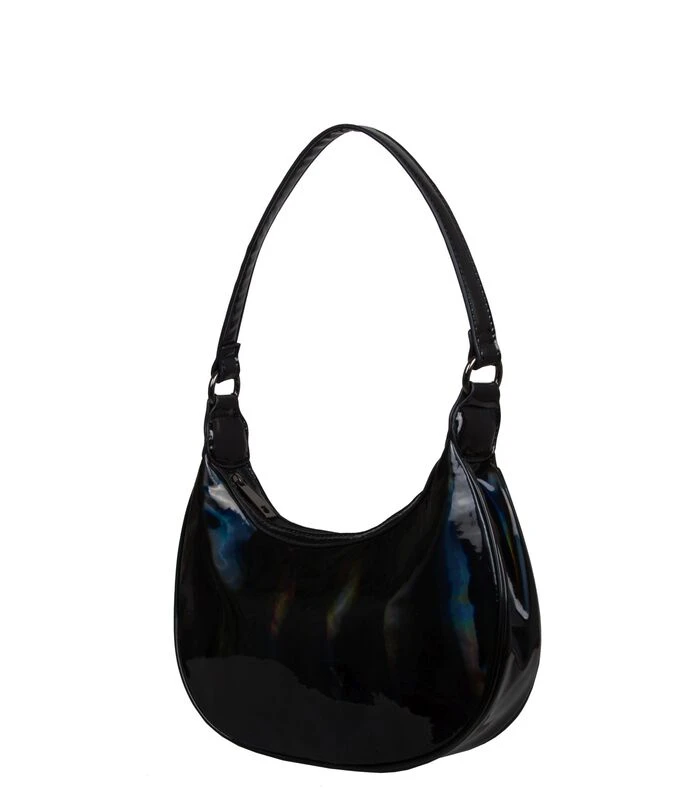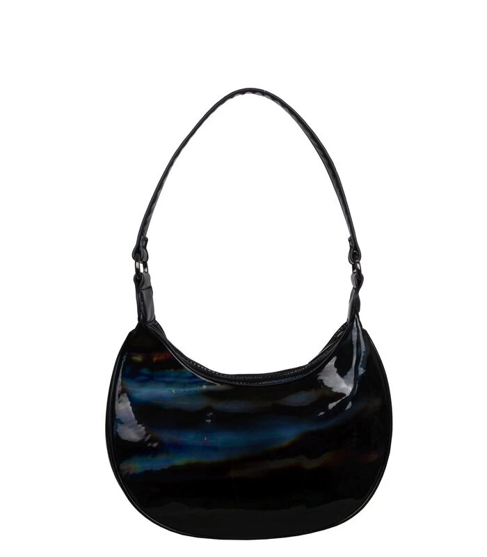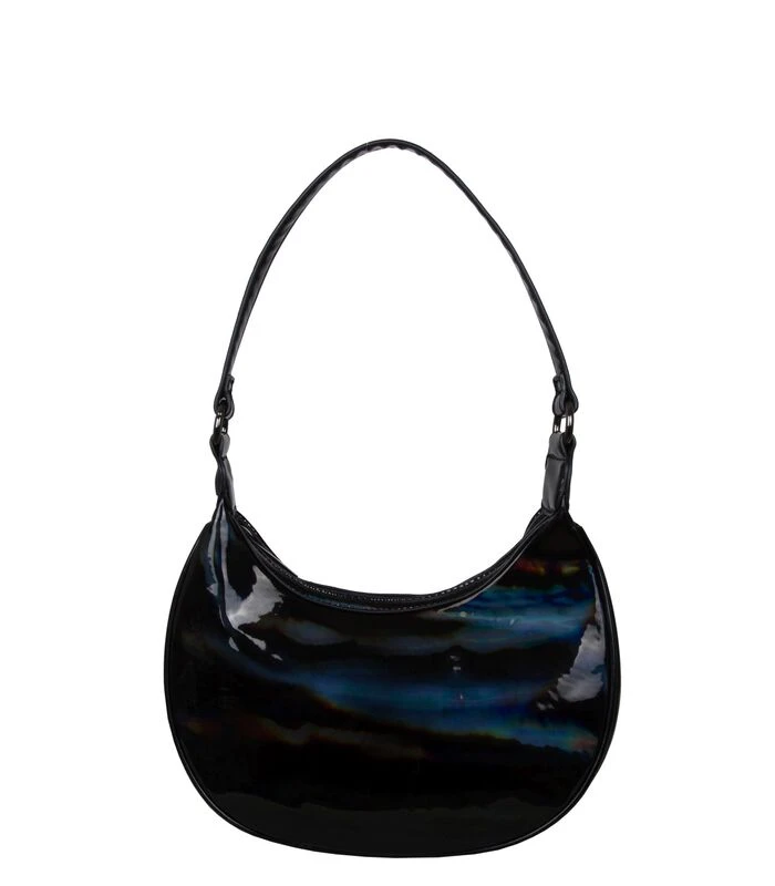 Deze opvallende hobo schoudertas Rainbow, is een prachtige aanvulling op je garderobe. De tas is vervaardigd van zogeheten eco leder, een milieuvriendelijke variant van imitatieleer. Door de waterborn techniek vindt er een waterbesparing plaats van maar liefst 80% bij de productie van dit materiaal. De tas is een echte eye–catcher en doet haar naam eer aan: Rainbow. Door lichtinval op de tas zie je alle kleuren van de regenboog op de zwarte tas. Deze hobo schoudertas heeft een enkele schouderband die je zeer prettig op de schouder draagt. Aan de binnenkant heeft deze tas een hoofdcompartiment met één binnenvakje. De tas kan worden afgesloten middels een rits. De metaalkleur heet ‘gun metal’ en is een donkere, antraciete kleur. De afmetingen (breedte / hoogte / diepte) van deze schoudertas zijn 27 x 26 x 06 cm.