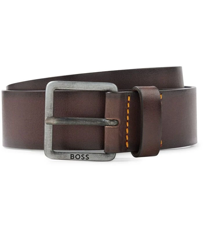 Je outfit is pas echt compleet met deze lederen riem van Hugo Boss. Kies voor deze stijlvolle riem met mooie afwerking en moderne uitstraling. Deze herenriem heeft een bruine kleur en is voorzien van een zilverkleurige gesp en oranje stiksels.Bruin gekleurdGemaakt van 100% leer4 centimeter breed