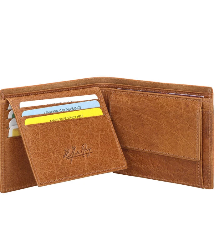 Een stoere heren billfold, uitgevoerd in gewaxt rundleder. De binnenzijde is voorzien van een muntvak met druksluiting en twee vakken voor papiergeld. Aan de andere kant zit een klep die naar boven kan worden uitgevouwen, waar ruimte is voor zeven creditcards. Verder beschikt de billfold over een foto compartiment en twee extra insteekvakken.