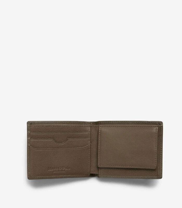 Ingetogen en met een sportieve elegantie: portemonnee voor heren van fijn generfd rundleer dat afkomstig is uit door de LWG gecertificeerde looierijen. Handige en doordachte indeling met een opgedeeld vak voor papiergeld, drie vakken voor pasjes, een steekvak en een met een drukknoop afsluitbaar muntvak. Openklapbare portemonnee zonder sluiting met een subtiel ingewerkt logo op de voorkant.