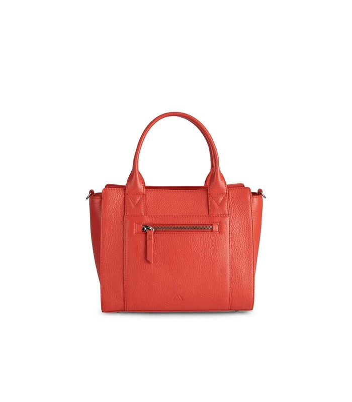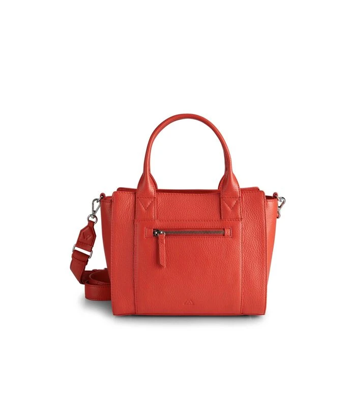MaikaMBG Bag, Grain, van Markberg is een mooie en klassieke leren handtas. Hij heeft een groot vak met twee binnenvakken, waarvan één met een ritssluiting en een kaarthouder voor drie creditcards. De tas sluit met een rits. Het heeft ook een extra ritsvak aan de buitenkant. Het handvat en de verstelbare en afneembare riem zijn van leer. De voering van de tas is van katoen.