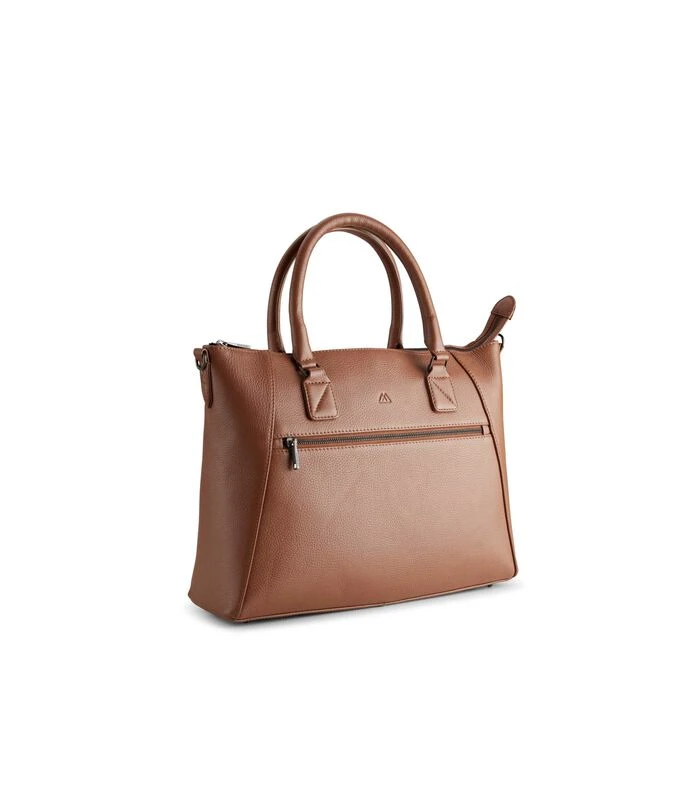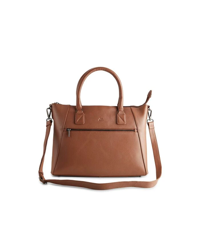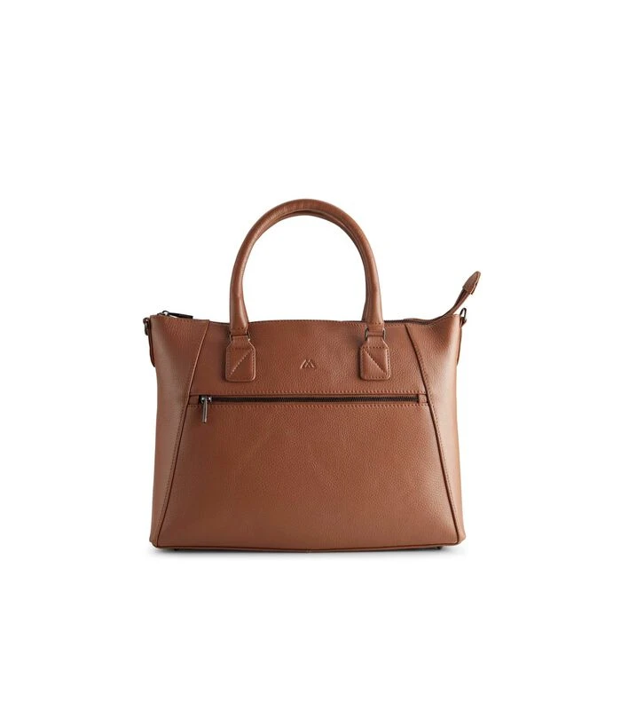 Werktas van hoogwaardig rundleer. Twee grote binnenvakken en een zak met rits. Kleine vakjes aan de binnenkant. Afneembare en verstelbare riem.
