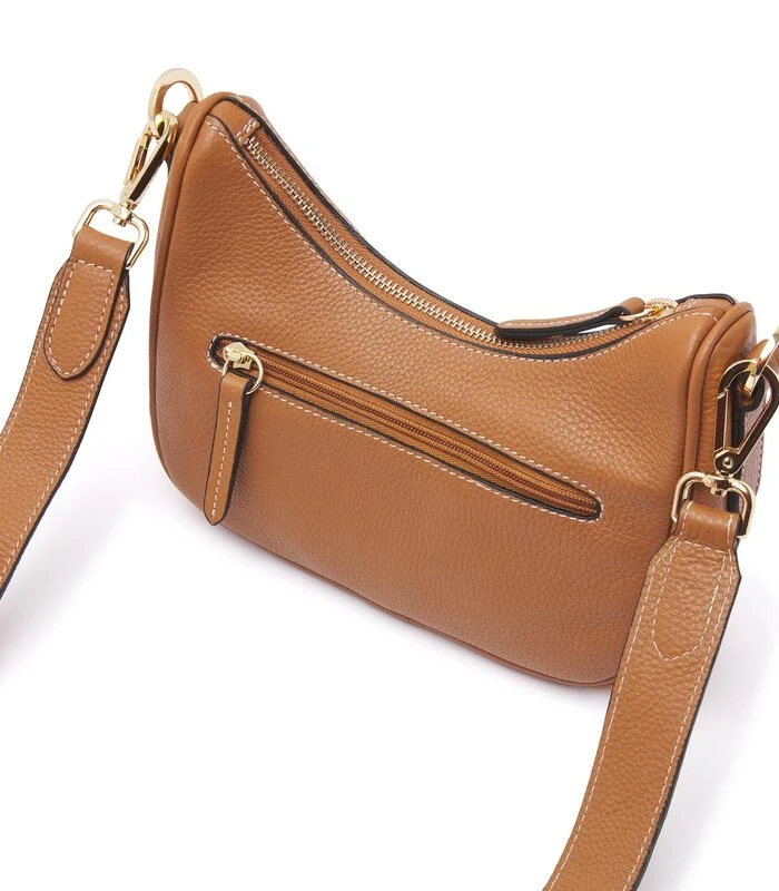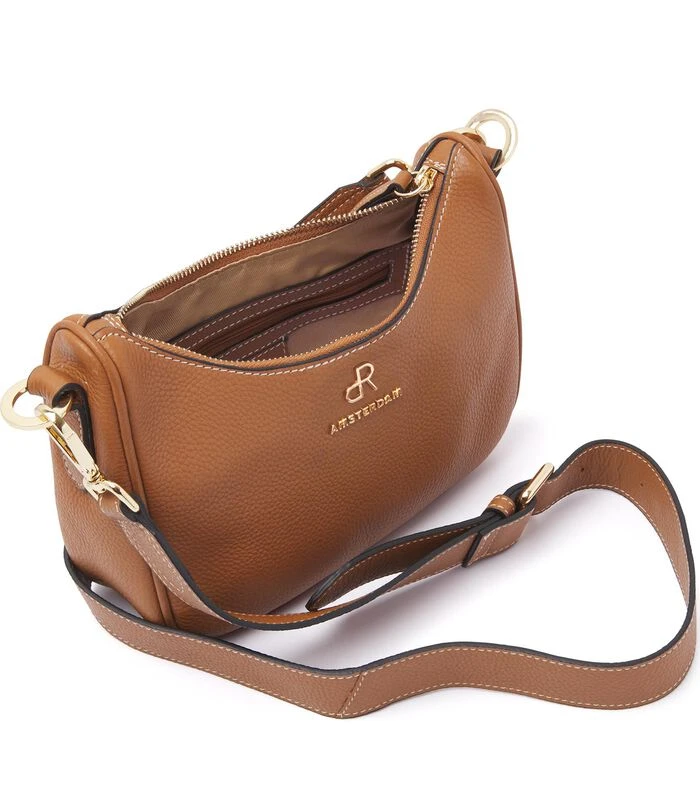Deze mooie schoudertas is fijn van formaat, niet te groot maar zeker ook niet te klein. Het is een handig tasje om mee te nemen tijdens een dagje uit. De tas is veilig afsluitbaar met een rits aan de bovenzijde, waaronder zich een groot opbergvak bevindt. Aan de binnenzijde zit een ritsvakje voor kleinere spullen, een steekvak voor je telefoon en een sleutelhanger gevestigd. De achterzijde heeft een extra ritsvak om makkelijk spullen bij de hand te hebben, zonder de hele tas open te hoeven maken. Voor optimaal draagcomfort is er een brede afneembare en verstelbare schouderriem. En de tas is gemaakt van rundleder.