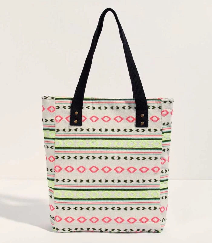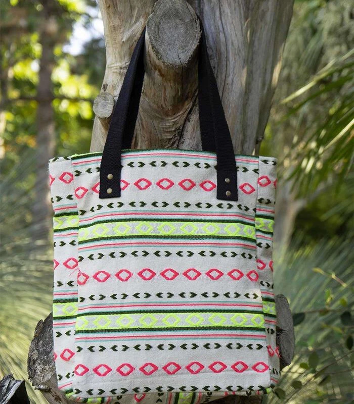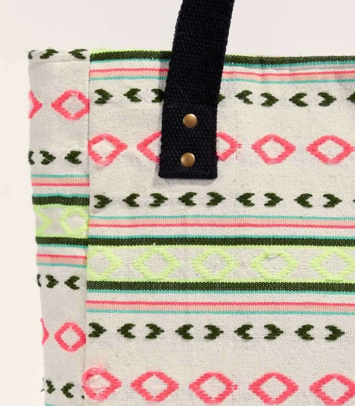 Zeer praktische en resistente katoenen draagtas met zijn canvas handvatten, maar ook zeer origineel en kleurrijk met zijn mooie details. Ideaal voor wandelingen in de stad of op het strand.