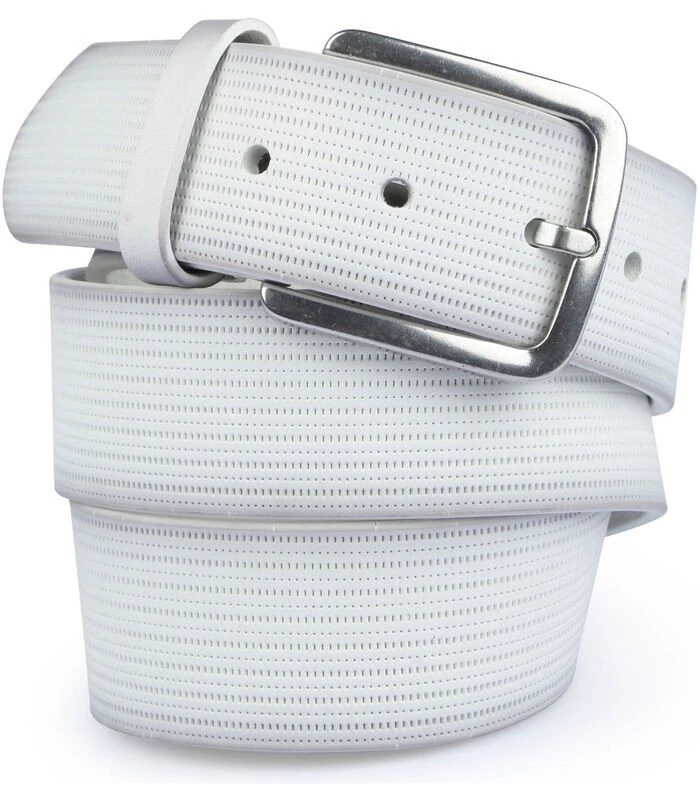 Je outfit is pas echt compleet met deze lederen riem van Suitable. De herenriem heeft een witte kleur in een structuur en is voorzien van een zilverkleurige gesp. Draag de riem bij uw favoriete jeans, een chino of een pantalon. Wit gekleurdGemaakt van leer3,8 centimeter breed