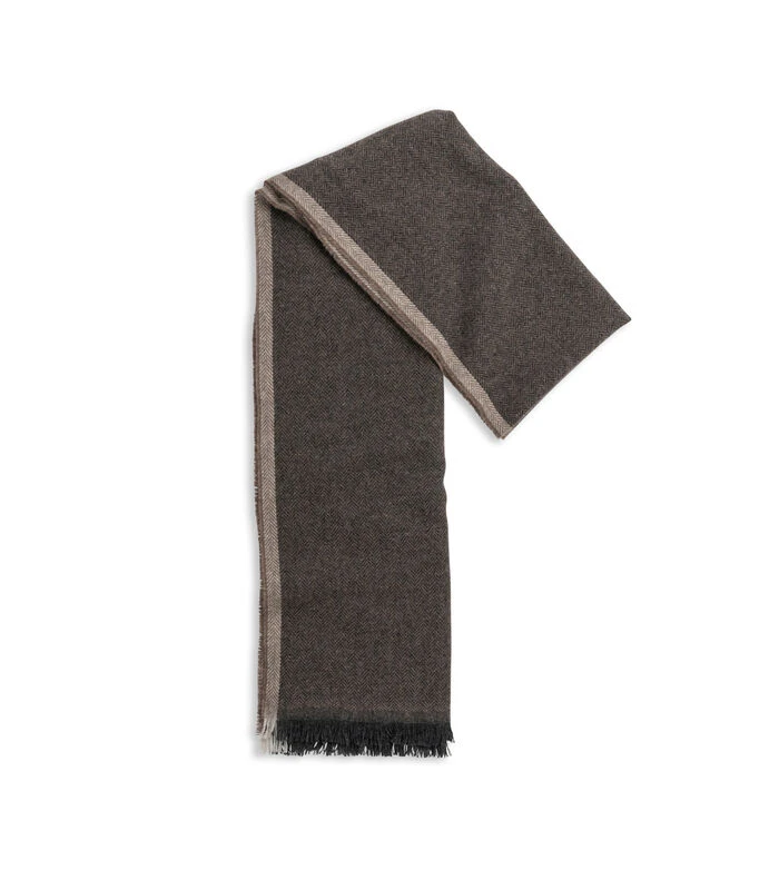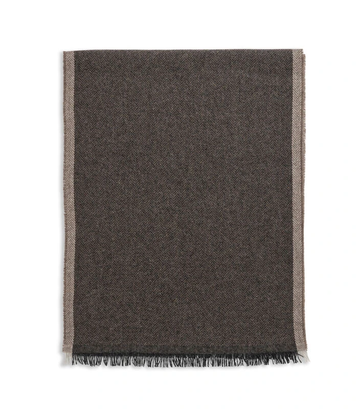 De Chancery Place sjaal is in Italië vervaardigd van zachte geregenereerd kasjmier met een contrasterend boordje en franjes.