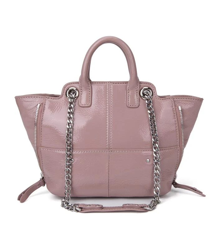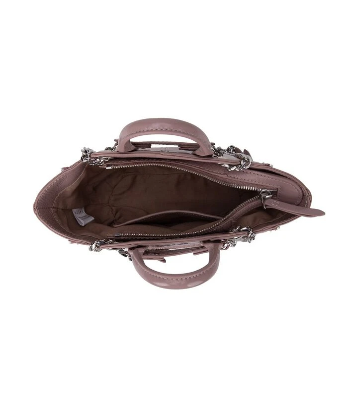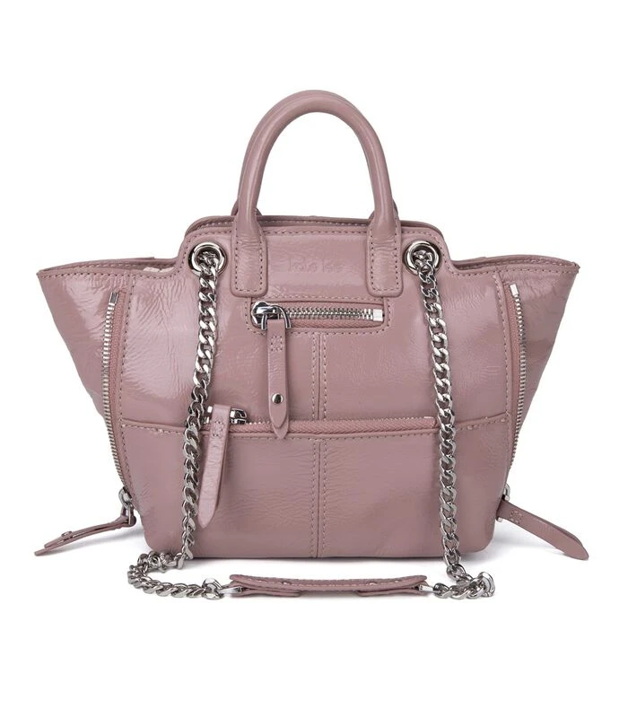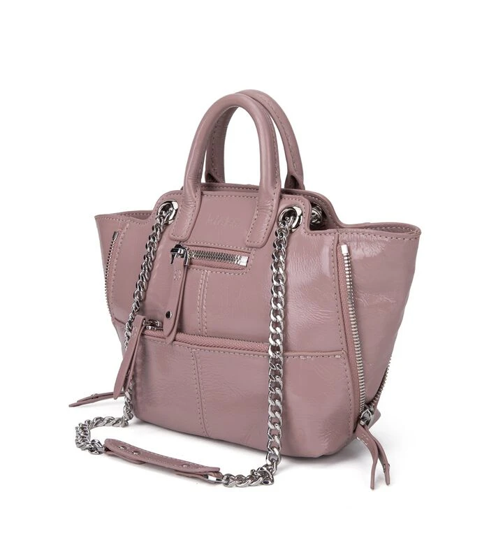 Kleine handtas die met de hand of crossbody met de ketting wordt gedragen Ritssluiting Dubbel handvat in leer en ketting 2 voorzakken met rits Dubbele handgrepen Verstelbare vorm: 2 zijritsen voor een trapeziumvorm of vierkant Binnenkant: 1 opgestikte zak Katoenen voering Hardware in zilveren afwerking Buitensamenstelling : 100% koeienleer Samenstelling binnenkant: 100% katoen
