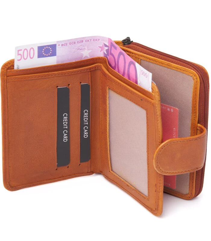 Deze damesportemonnee is gemaakt van zacht rundleder en is zeer praktisch. De portemonnee bestaat uit twee delen: een vak met rits voor muntgeld en een vak met klep met druksluiting waar plaats is voor negen creditcards, waarvan een met kijkvenster. Er zijn twee steekvakken voor papiergeld en nog een extra vak met kijkvenster. Daarnaast bevat de portemonnee nog vijf extra steekvakken.