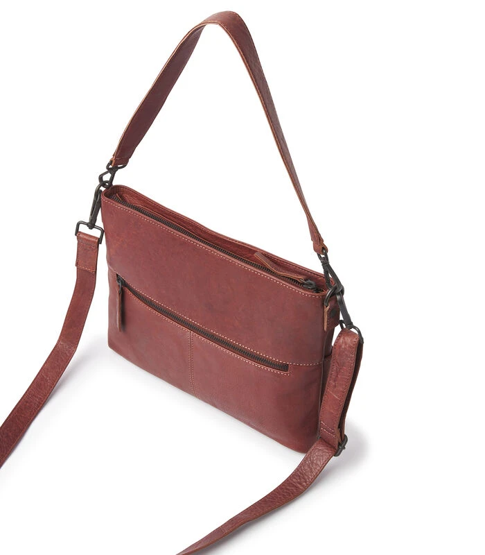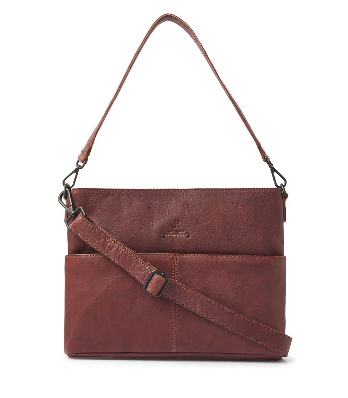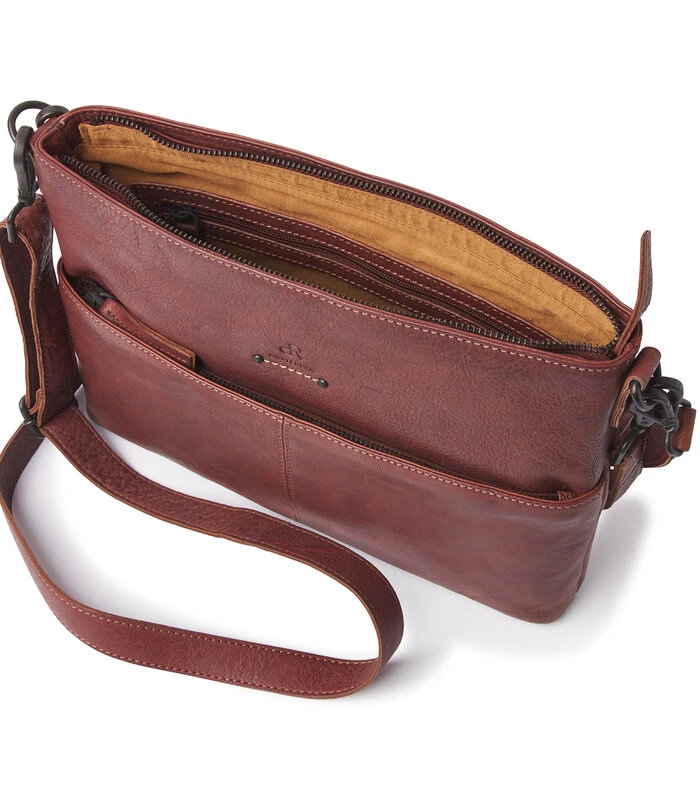 Als je kijkt naar het formaat is dit een handige schoudertas welke veilig af te sluiten is met een rits aan de bovenzijde. De schoudertas is gemaakt van gewaxt rundleder en beschikt over een lang handvat. Tevens heeft de tas een verstelbare en afneembare schouderriem waardoor de tas als crossover gedragen kan worden. De tas heeft zowel een ritsvak aan de achterzijde als aan de voorzijde voor het opbergen van kleine spullen. Aan de binnenzijde heeft de tas een ritsvak, een speciaal telefoonvak en een keycord.
