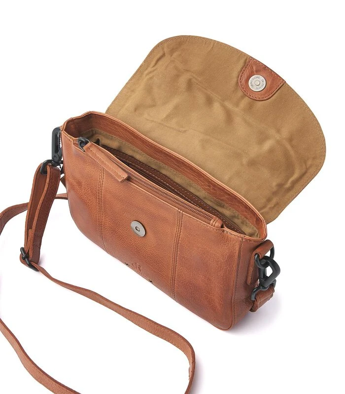 Dit schoudertasje is gemaakt van zacht rundleder en beschikt over een afneembare en verstelbare schouderband. Het opbergvak wordt afgesloten met een overslag met magneetsluiting. Hieronder bevinden zich twee ritsvakken, een speciaal vak voor je telefoon en een sleutelhanger. De achterzijde heeft ook een ritsvak.