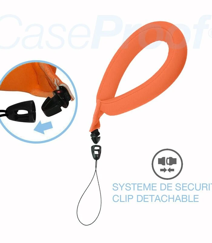Drijvende riem CaseProoféDe drijvende riem CaseProofé maakt het mogelijk om uw smartphone of camera mee te nemen op al uw wateractiviteiten, zonder het risico om deze te verliezen op de bodem van het water.1 helder oranje drijvende riemDe drijvende riem CaseProof é is compatibel met sportcamera’s (type Go–pro).