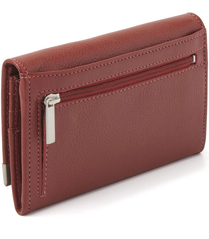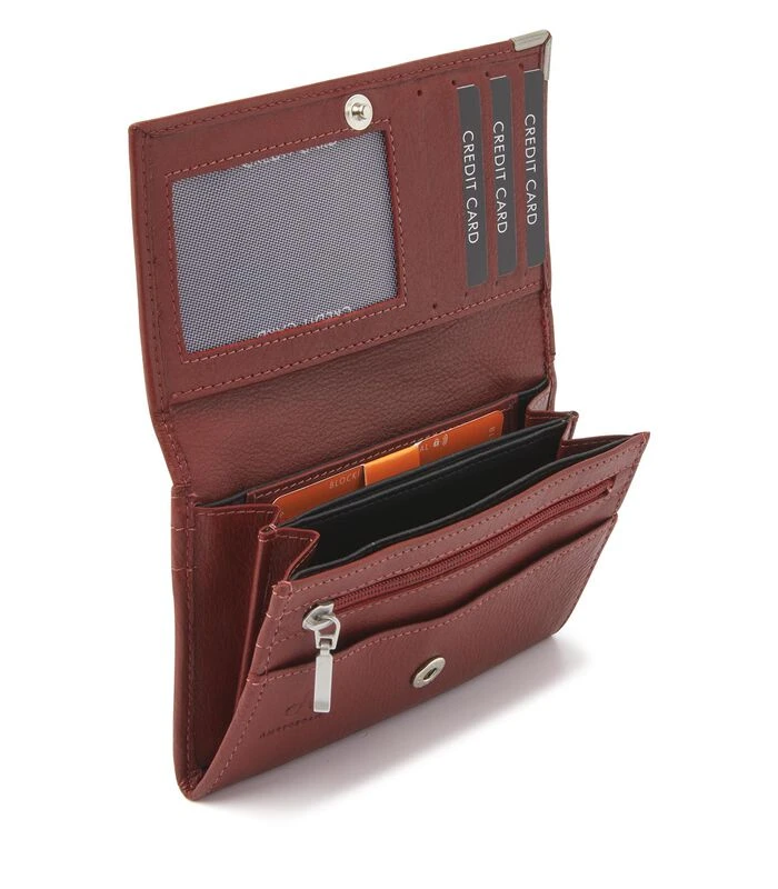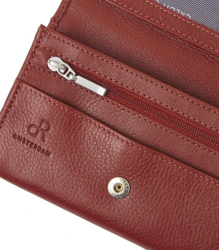 Deze damesportemonnee is gemaakt van zacht rundleder en heeft een klassieke uitstraling. Onder de klep met druksluiting is plaats voor zes betaalpassen, waarvan een met kijkvenster. Er zijn twee steekvakken voor papiergeld en nog zes extra steekvakken, waarvan een met rits. De achterzijde van de portemonnee bevat een vak voor muntgeld welke afgesloten wordt met een rits. Deze portemonnee beschikt over RFID protectie. Dit beschermt tegen het skimmen van betaalpassen.