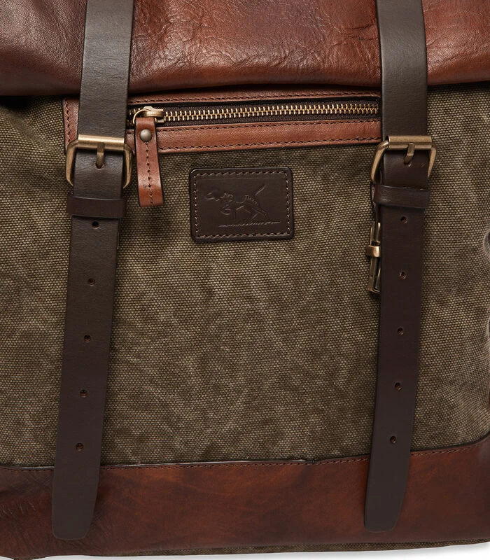 Deze prachtigerugzak is in Italië vervaardigd van zacht, met antiek afgewerkt leer en gewassenItaliaans canvas met contrasterende leren banden en met antiek messingafgewerkte hardware. Er zijn externe voor– en achterzakken met rits, enbinnenin vind je een ritsvak, 2 apparaatmouwen en een groot compartiment,allemaal gevoerd met zacht canvas.