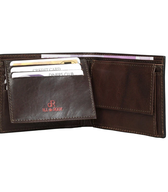 Een stoere heren billfold, uitgevoerd in gewaxt rundleder. De binnenzijde is voorzien van een muntvak met druksluiting en twee vakken voor papiergeld. Aan de andere kant zit een klep die naar boven kan worden uitgevouwen, waar rumte is voor zeven creditcards. Verder beschikt de billfold over een foto compartiment en twee extra insteekvakken. Deze billfold beschikt over RFID protectie. Dit beschermt tegen skimmen van betaalpassen.