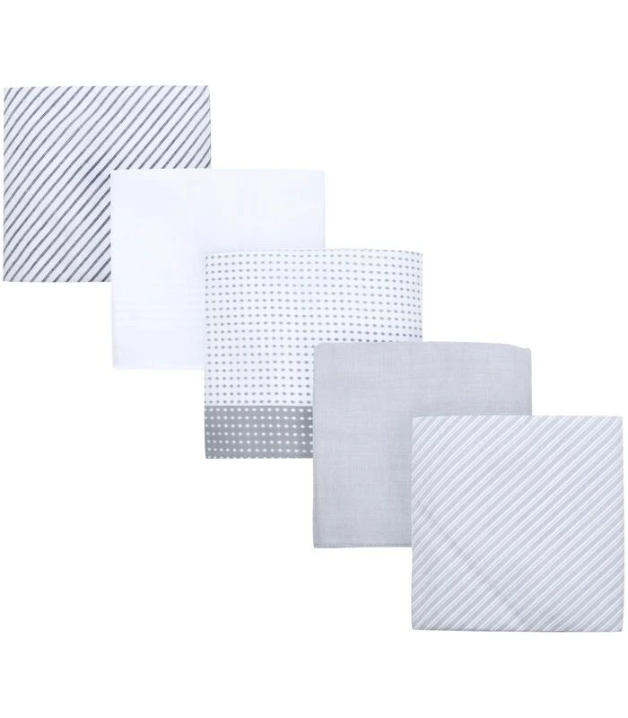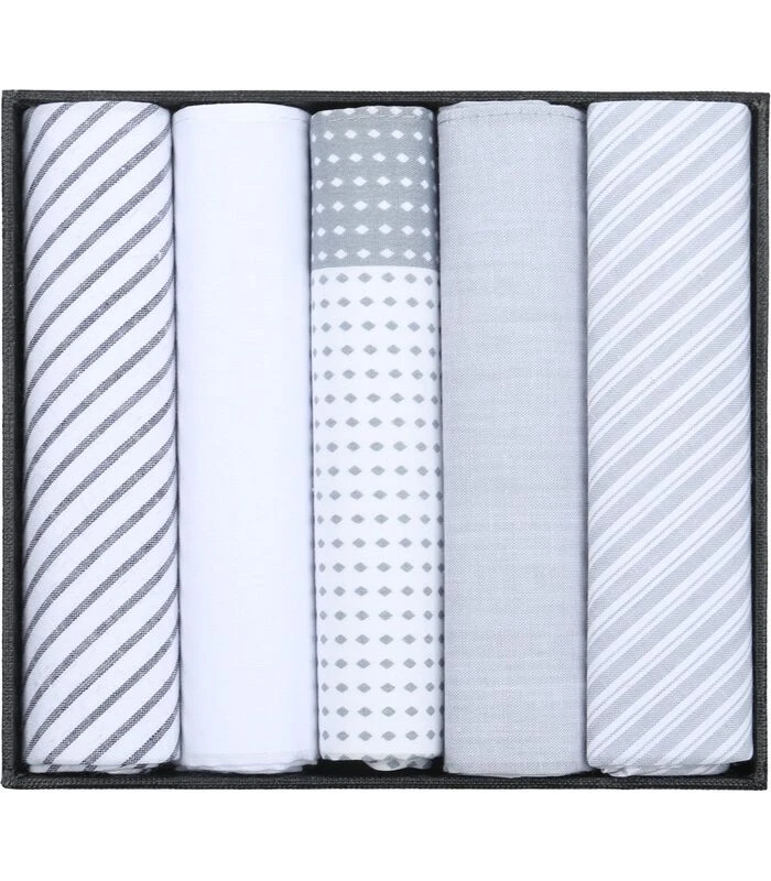 Luxe set met 5 herenzakdoeken, in een stijlvolle blauwe kleur. De zakdoeken hebben allen een divers patroon en voelen comfortabel aan dankzij het zacht geweven katoen. De Hanky modellen hebben een afmeting van 40×40 cm.Suitable Hanky Zakdoeken 5–PackVijf zakdoeken in een grijze kleur met diverse patronenAfmeting van 40 x 40 cmGemaakt van 100% zacht katoen